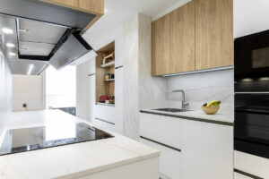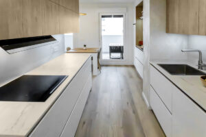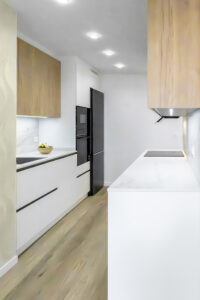 Esta cocina apuesta por un diseño moderno y muy luminoso, donde el blanco se combina con frentes en madera natural para crear un ambiente cálido y actual. Las líneas rectas y los muebles con tirador tipo gola, refuerzan la sensación de orden y limpieza visual, dando como resultado un espacio equilibrado y atemporal.