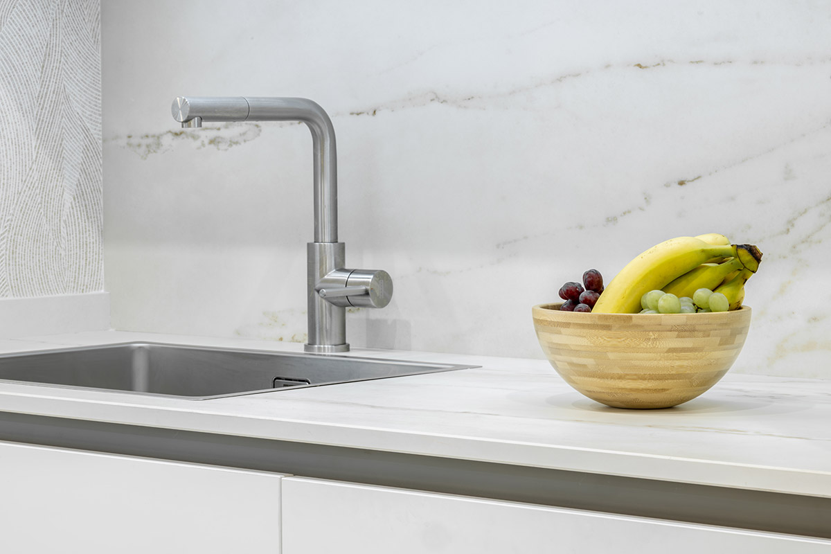 La zona de columnas integra los electrodomésticos, logrando una composición limpia y funcional, mientras que la encimera y el frente en acabado piedra clara aportan continuidad y resistencia al conjunto. La distribución, pensada al detalle, facilita el trabajo diario y maximiza el espacio disponible.